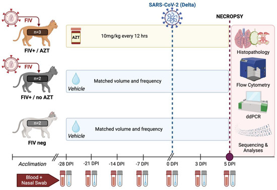 This study lasted a total of 33 days and included a total of n = 7 cats (n = 5 FIV-infected; n = 2 FIV-negative). FIV-infected cats were not treated with any antiretroviral therapy prior to arrival at Oklahoma State University, and all were apparently healthy at the time of study initiation. After an acclimation period, Zidovudine (henceforth referred to as AZT) was initiated in three FIV-infected cats. AZT (50 mg/mL) was administered at 10 mg/kg every 12 h by mouth for 28 days. All animals not in the treatment group (n = 4) received equivalent volumes of vehicle by mouth. After 28 days of AZT or vehicle administration, all cats (n = 7) were intratracheally and intranasally inoculated with SARS-CoV-2. In brief, cats were anesthetized with ketamine (4 mg/kg) (Covetrus, Dublin, OH, USA), dexmedetomidine (20 μg/kg) (Orion, Espoo, Finland), and butorphanol (0.4 mg/kg) (Zoetis, Girona, Spain) intramuscularly. Cats were positioned in ventral recumbency and intubated so that the end of an endotracheal tube was positioned within the distal trachea as described previously [16]. Using a 3 cc syringe, 3 × 105/kg SARS-CoV-2 (Delta Variant) was inoculated intratracheally, followed by 4 × 105/cat intranasally (0.5 ml split between 2 nostrils). Six days after SARS-CoV-2 inoculation, all cats were culled for final necropsy and tissue collection. This is visually outlined in Figure 1.