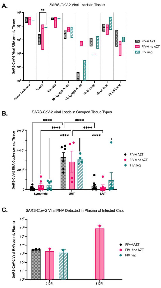 Tissues collected at necropsy at 5 DPI were evaluated for SARS-CoV-2 viral RNA per mL of tissue for all groups using ddPCR. Within specific tissue collections, no significant differences were noted between groups except for a significant increase in SARS-CoV-2 viral load in the tonsil of FIV-negative cats as compared with FIV+/AZT-treated cats (p = 0.0058) (Figure 4A). Significantly increased SARS-CoV-2 viral loads were detected in upper respiratory tract tissues (nasal turbinates and distal trachea) as compared to lower respiratory tract tissues (right cranial, right middle, and right caudal lung lobes) and lymphoid tissues (tonsils, retropharyngeal lymph nodes, and tracheobronchial lymph nodes) within all three groups (p = 0.0055) (Figure 4B). SARS-CoV-2 viral RNA was also quantified from plasma collected at 0, 3, and 5 DPI using ddPCR. No SARS-CoV-2 was detected at 0 DPI in plasma but was detected at 3 DPI in plasma of all three cats from the FIV+/AZT group, one of two cats from the FIV+/no AZT group, and one of two cats from the FIV-negative group. This SARS-CoV-2 significantly dropped to “not detected” at 5 DPI in the FIV-negative and FIV+/AZT groups (p = 0.0025). Interestingly, at 5 DPI, only one cat maintained detectable SARS-CoV-2 RNA in plasma, and this cat was from the FIV+-untreated group with over three-fold higher viral load as compared with the 3-DPI load in that same cat (Figure 4C).