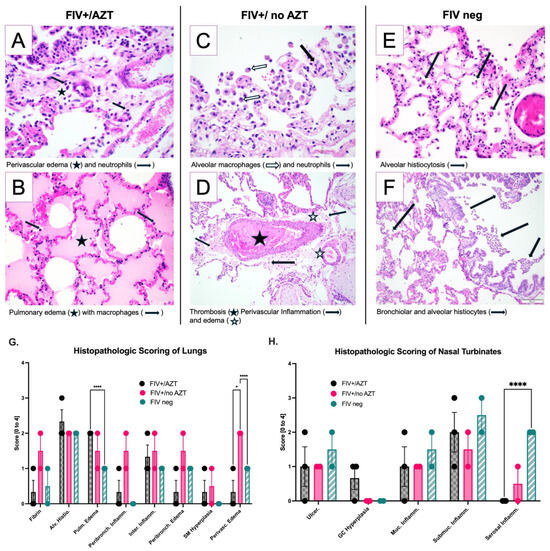 Comparisons of histopathologic disease noted in SARS-CoV-2 infected cats. Lungs from FIV+/AZT cats exhibited minimal to mild interstitial inflammation ((A), arrows) and perivascular edema ((A), star), mild to moderate alveolar histiocytosis ((B), arrows), and mild serous exudate/pulmonary edema ((B), star). Lung tissue from FIV+/no AZT cats exhibited moderate alveolar histiocytosis ((C), white arrow), minimal to mild serous exudate/pulmonary edema ((D), white star), minimal to mild intra-alveolar inflammation ((C,D) black arrow), and thrombosis ((D), black star). FIV-negative cats demonstrated moderate alveolar histiocytosis ((E), black arrow), and moderate alveolar and bronchial histiocytosis ((F), black arrow). (G) summarizes the histopathology scoring of collected lung tissues from all three groups; minimal serous exudate/pulmonary edema is noted in the FIV+/AZT group. FIV-negative cats displayed a significant increase in perivascular edema (Perivasc. Edema) and minimal to no lesions of intra-alveolar inflammation. (H) summarizes the nasal turbinate histopathology scoring showing a significant increase in muscular/serosal inflammation in FIV-negative compared to FIV+/AZT. In total histopathology scoring, lungs were assessed for intra-alveolar fibrin (Fibrin), alveolar histiocytosis (Alv. Histio.), serous exudate/pulmonary edema (Pulm. Edema), peribronchial inflammation (Peribronch. Inflamm.), interstitial inflammation (Inter. Inflamm.), smooth muscle hyperplasia (SM Hyperplasia), and perivascular edema (Perivasc. Edema). Nasal turbinates were assessed for ulceration (Ulcer.), goblet cell hyperplasia (GC Hyperplasia), mucosal inflammation (Muc. Inflamm.), submucosal gland inflammation (Submuc. Inflamm.), and muscular/serosal inflammation (Serosal Inflamm.). **** p < 0.0001; * p < 0.05. scale bar seen on image (F) applies to all histology images in this figure.