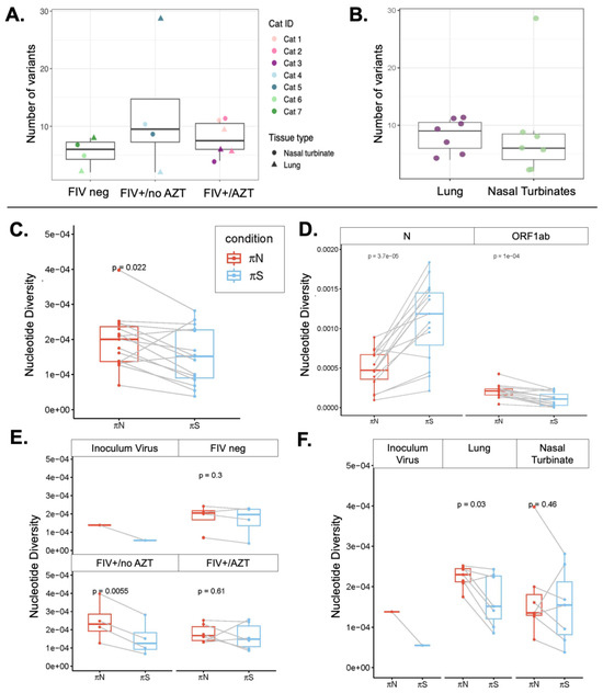 (A) Each point indicates the number of variants detected at ≥3% allele frequency in SARS-CoV-2 genome from each cat sample. There was no significant difference in the number of within-host variants among treatment groups (ANOVA, df = 2, p = 0.419). (B) Each point indicates the number of variants detected at ≥3% frequency in SARS-CoV-2 genome from each cat sample. There was no significant difference in the number of within-host variants between tissue types (t-test, df = 6, p = 0.4803). (C–F) Signatures of positive (πN > πS) and purifying (πN < πS) selection are observed in SARS-CoV-2 genomes from different cat samples and groups: (C) the investigation of selection through the comparison of nonsynonymous (πN) and synonymous (πS) nucleotide diversity revealed that measurements of πN in our dataset were significantly greater than πS at the within-host population or whole-genome level (t-test: t = 2.5828, df = 14, p-value = 0.02169). (D) SARS-CoV-2 ORF1ab showed signs of positive selection (p-value = 0.00001), while a significant signature of purifying selection was observed in the nucleocapsid (N) gene (p-value = 0.000037). (E) FIV+/no Tx group had a signature of positive selection as compared to other cat groups (p-value = 0.0055. (F) Comparing between tissue types, lung samples demonstrated signatures of positive selection overall (p-value = 0.03).