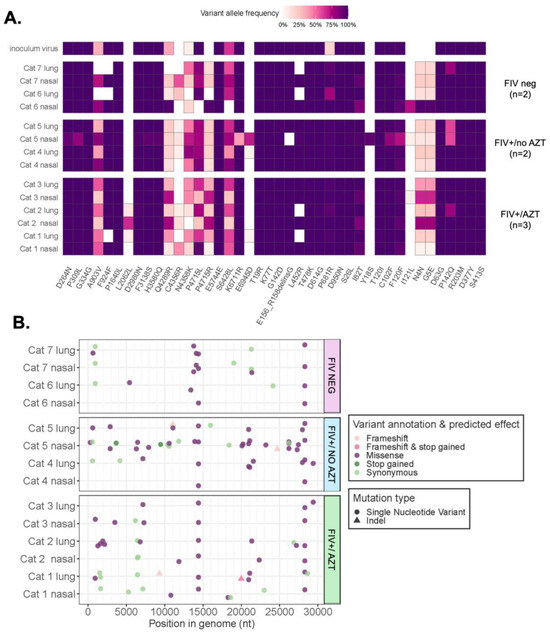 A map of SARS-CoV-2 genomic variation was visualized by aligning all the sequences generated from both the cat and the inoculum RNA to a wildtype reference sequence, MN908947.3, which is derived from the Wuhan-Hu-1 isolate (Figure 7A,B). In the seventy-six variants observed in viral RNA recovered from cats but not detected at any level in the viral inoculum, a predominance of missense or nonsynonymous single-nucleotide variants was noted (Figure 7B). The bioinformatic analysis revealed the emergence of new mutations and the absence of other mutations in viral RNA recovered from cats (Table 2). Furthermore, certain mutations present in the viral inoculum appeared to be amplified in cats, whereas others appeared to be weakened. In the spike gene, the L452R mutation was present at a high allele frequency in the inoculum while it was absent in lung tissue in both cat groups: FIV+/AZT and FIV-negative. In addition, the P681R mutation was presented at less than a 25% allele frequency in the inoculum; meanwhile, it was significantly present in cat viral RNA (Table 2).