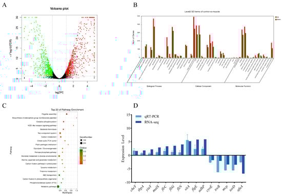 A transcriptomics analysis revealed that a total of 1341 DEGs were identified in the muscle group compared to the control group, of which 725 genes were significantly up-regulated and 616 genes were significantly down-regulated (Figure 1A). The functions of these 1341 DEGs were annotated and analyzed by GO. Most DEGs were involved in the following functions: cellular processes, single-organism processes, metabolic processes, cell parts, catalytic activity, and binding (Figure 1B). A KEGG pathway enrichment analysis showed that the DEGs were enriched in the flagellar assembly, oxidative phosphorylation, bacterial chemotaxis, two-component system pathways (Figure 1C). The results of the qPCR were consistent with the trends of transcriptome sequencing, indicating the reliability of the sequencing (Figure 1D).