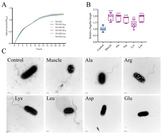 The host muscle and its dominant amino acids, except Asp and Glu, did not affect the growth of V. harveyi (Figure 2A). However, Asp and Glu almost inhibited bacterial growth. After detection, the pH of the 2216E medium with Asp or Glu added was only about 3.2, the bacteria did not grow after inoculation in these media, and the pH of the medium did not change. After induction, the relative flagellar length of V. harveyi was 1.9, which indicated that the length of the flagella was almost doubled. In addition, Ala, Leu, and Arg significantly influenced flagellar length (Figure 2B). Electron microscope observation found that the number of polar flagella of V. harveyi changed from one to two after induction by Leu, indicating that Leu induction affected the length of bacterial flagella and the number of flagella (Figure 2C). In contrast, V. harveyi lost flagella after induction by Asp and Glu.