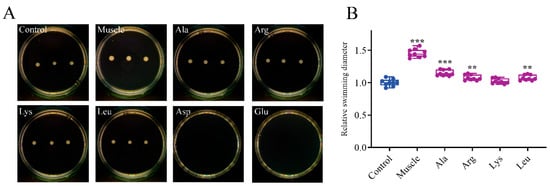 Effects of host muscle and its dominant amino acids on swimming motility of V. harveyi. (A) Bacteria swimming on semisolid plates. (B) Relative swimming diameter. Data are represented using a boxplot graph showing the median, inter-quartile range, upper and lower quartiles, and whiskers. The circles represent the original data. ** means p < 0.01, *** means p < 0.001.
