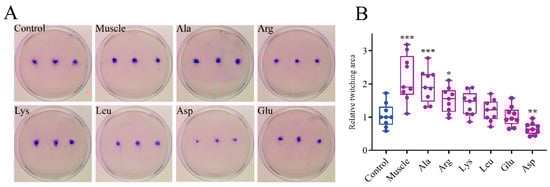 Effects of host muscle and its dominant amino acids on twitching motility of V. harveyi. (A) Crystal violet-stained twitching area. (B) Relative twitching area. Data are represented using a boxplot graph showing the median, inter-quartile range, upper and lower quartiles, and whiskers. The circles represent the original data. * means p < 0.05, ** means p < 0.01, *** means p < 0.001.