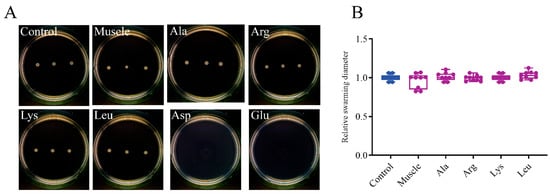 Effects of host muscle and its dominant amino acids on swarming motility of V. harveyi. (A) Bacteria swarming on semisolid plates. (B) Relative swarming diameter. Data are represented using a boxplot graph showing the median, inter-quartile range, upper and lower quartiles, and whiskers. The circles represent the original data.
