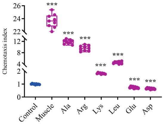 Effects of host muscle and its dominant amino acids on the expression levels of chemotaxis genes. Data are represented using a boxplot graph showing the median, inter-quartile range, upper and lower quartiles, and whiskers. *** means p < 0.001.