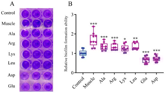 The results in Figure 7 show that the adhesion ability of V. harveyi is 3.8 times and 2.46 times that of the control after muscle and Ala induction, respectively. After Arg, Lys, and Leu induction, bacterial adhesion ability was also significantly enhanced. Meanwhile, Asp and Glu decreased the adhesion ability of V. harveyi.