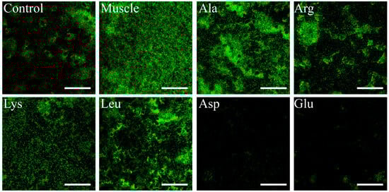 Both the results of the crystal violet method (Figure 8) and confocal laser microscope (Figure 9) showed that the biofilm formation ability of V. harveyi was significantly improved after induction by muscle and dominant amino acids (except Asp and Glu), among which muscle had the strongest ability to induce bacterial biofilm formation. However, the ability of bacterial biofilm formation decreased under Asp and Glu induction.