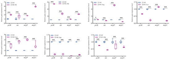 Effects of host muscle and its dominant amino acids on the expression levels of some methyl-accepting chemotaxis proteins. Data are represented using a boxplot graph showing the median, inter-quartile range, upper and lower quartiles, and whiskers. * means p < 0.05, *** means p < 0.001.