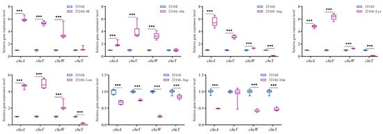 The cheA, cheV, and cheW expression levels were significantly up-regulated under muscle and dominant amino acid induction, except Asp and Glu. However, the expression of cheY remained unchanged or significantly down-regulated under induction. The expression levels of all chemotaxis genes were down-regulated under the induction of Asp and Glu (Figure 11).