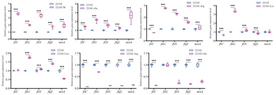 The results in Figure 12 indicate that the expression levels of detected flagellar genes were significantly up-regulated under the induction of muscle and Ala. The expression levels of some flagellar genes were significantly up-regulated under the induction of Arg, Lys, and Leu. The expression levels of almost-detected flagellar genes were significantly down-regulated under the induction of Asp and Glu.