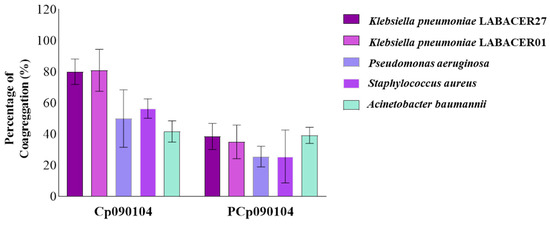 After 10 h of incubation of Cp090104 with the pathogenic strains, a notable capacity to coaggregate with K. pneumoniae LABACER01 and LABACER27 was observed, reaching coaggregation percentages of approximately 80% in both cases. Conversely, the lowest coaggregation percentage was detected for A. baumannii, with only 41% (Figure 2). When evaluating the coaggregation ability of PCp090104 with respiratory pathogens, percentages were approximately half the value of those found with Cp090104, except for A. baumannii, which showed similar values to those found with the live respiratory commensal bacterium (Figure 2).