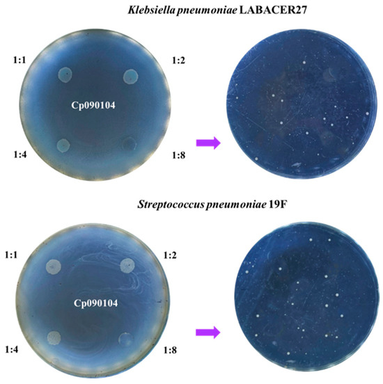 Next, the ability of C. pseudodiphtheriticum 090104 to inhibit the growth of respiratory pathogens was evaluated. In this assay, the interaction between pathogenic bacteria and Cp090104 was evaluated using agar medium containing the respiratory commensal bacterium, to which the pathogens were added (Figure 3). In this method, a concentration of Cp090104 equal to or greater than (1:1, 1:2, 1:4, and 1:8) that of the microorganisms to be tested is used, simulating a previous colonization of the respiratory commensal bacterium at the contact site with the pathogens. An inhibitory effect by Cp090104 on K. pneumoniae LABACER27 and S. pneumoniae 19F was observed when they were inoculated at a 1:8 dilution (Figure 3).