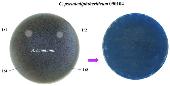 The potential inhibitory effect of the respiratory pathogens on C. pseudodiphtheriticum 090104 was also evaluated (Figure 4). For this study, the respiratory commensal bacterium was cultured on agar plates previously inoculated with the different pathogens. No inhibitory effects on Cp090104 were observed when K. pneumoniae LABACER01 and LABACER27, P. aeruginosa, S. aureus, or S. pneumoniae 19F were studied. Conversely, A. baumannii was able to inhibit the growth of Cp090104 from a 1:4 dilution (Figure 4). This inhibition was complete, as no development of Cp090104 was observed after swabbing the surface of the 1:4 dilution following contact with A. baumannii (Figure 4), indicating a bactericidal effect. The inhibition study using growth curves of the respiratory commensal bacterium allowed us to determine that it is inhibited by A. baumannii at doses less than or equal to 104 CFU/mL.