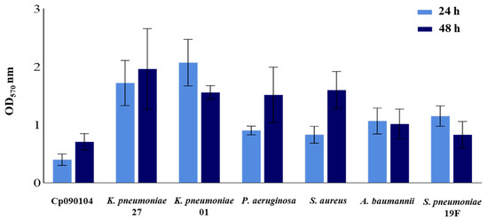 The capacity of Cp090104 to form biofilms on an abiotic surface was studied and compared with respiratory pathogens (Figure 5). Under the experimental conditions of this work, all the pathogenic microorganisms were able to form biofilms after 48 h of incubation, with K. pneumoniae LABACER01 and LABACER27 being the most efficient in achieving this effect. Taking into account Stepanović et al.’s classification [34], which considers the variation in biofilm formation between 24 and 48 h, respiratory pathogens were classified as weakly adherent (A. baumannii, P. aeruginosa, and S. pneumoniae 19F) or moderately adherent (K. pneumoniae LABACER27 and LABACER01, and S. aureus). On the other hand, the results showed that Cp090104 was not able to form a biofilm on the abiotic surface and exhibited weak adherence (Figure 5).