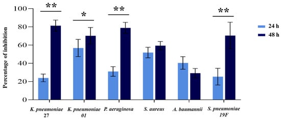 Additionally, the ability of the cell-free supernatant of Cp090104 to inhibit biofilm formation by different respiratory pathogens was evaluated (Figure 6). After 24 h of incubation, biofilm formation had at least a 20% of inhibition for all microorganisms, with K. pneumoniae LABACER27 and LABACER01 being the most and least inhibited biofilm-forming pathogens, respectively (Figure 6). After 48 h of incubation, the supernatant of Cp090104 exerted a greater inhibitory effect on biofilm formation in all bacteria except A. baumannii and S. aureus, which remained at similar percentages to those found at 24 h (Figure 6).