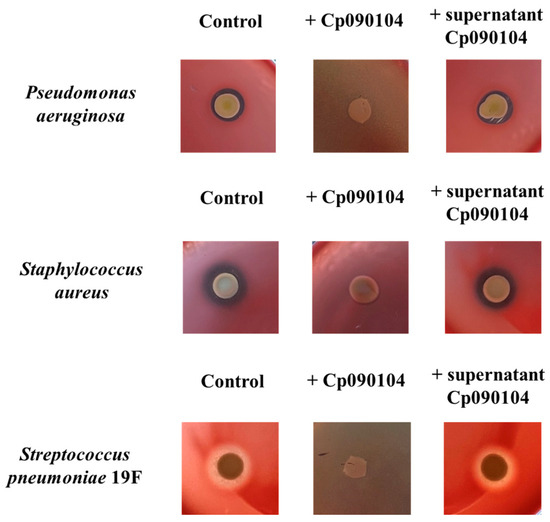 When pathogens were cultured on blood agar in the presence of Cp090104, a loss of hemolytic activity was detected for P. aeruginosa, S. aureus, and S. pneumoniae 19F (Table 2 and Figure 7). No changes in hemolytic activity were observed for K. pneumoniae LABACER27 and LABACER01, and A. baumannii in the presence of Cp090104. Additionally, it was observed that the cell-free supernatant of Cp090104 did not induce changes in the hemolytic activity of any of the evaluated pathogenic microorganisms (Table 2 and Figure 7).