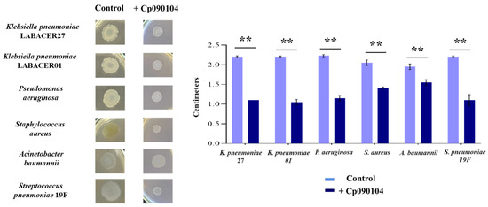 Colony morphology assay. Characterization of the effect of C. pseudodiphtheriticum 090104 (Cp090104) on the colony morphology of respiratory pathogens when cultured on BHI agar medium. The diameter of colony was measured in the presence and absence of Cp090104. All tests were performed in triplicate; means with standard deviations are presented for each measurement. Significant differences between the indicated groups: (**) p < 0.01.