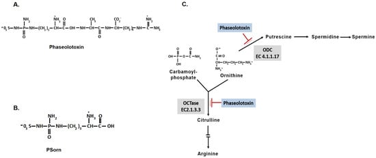 Structure and mechanism of action of phaseolotoxin. (A) Chemical structure of phaseolotoxin. Nδ-(N′-sulphodiaminophosphinyl)-ornithyl-alanyl-homoarginine. (B) Structure of octicidine [4]. Phaseolotoxin is cleaved by plant peptidases releasing the alanine and homoarginine residues, which results in octicine (Psorn) formation. (C) Targets of action of phaseolotoxin. The red lines indicate the biochemical reactions affected by the action of phaseolotoxin on the catalytic enzymes of these processes.