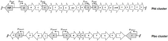 Similarly, the thermoregulation of most of the Pbo cluster genes was also demonstrated [24]. By RT-PCR analyses, it was observed that the genes pboO, pboN, pboM, pboL, pboK, pboA, pboC, pboE, pboF, and pboG, belonging to the pboO-pboP, pboK-pboN, and pboA-pboI operons, are transcribed at high levels at 18 °C but with undetectable or basal levels of expression at 28 °C. Only the monocistronic transcriptional unit pboJ was constitutively expressed at both temperatures (28 °C and 18 °C) [24,33,43]. Although the expression pattern of the Pbo cluster genes as a function of temperature has been validated for the majority of these genes by various studies, different expression patterns have been reported for the pboM gene (PSPPH_4547), in which a differential expression at low temperatures (18 °C) and even similar expression at both temperatures (28 °C and 18 °C) has been observed [24,33]. However, this fact could be related to the qualitative techniques used in these studies.