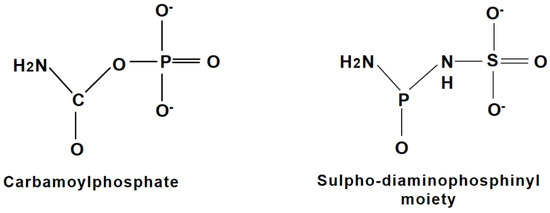 Chemical structure of phaseolotoxin intermediates and similar molecules. (Left): Chemical structure of carbamoylphosphate. (Right): Structure of the inorganic moiety of phaseolotoxin (sulpho-diaminophosphinyl). The figures have been adapted from [14,49].