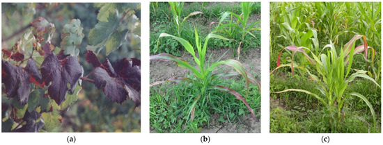 Plants infected with ‘Ca. P. asteris’ (16SrI-B): in (a) grapevine leaves showing reddening and downward curling in Chile; in (b,c), corn plants showing reddening of young leaves in Colombian cultivations.