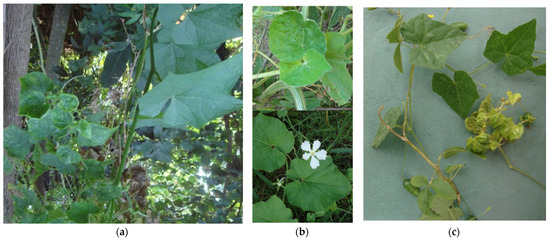 Despite the variety of phytoplasma subgroups in group 16SrIII, subgroup 16SrIII-J is prevalent in Brazil. It was described for the first time in association with chayote witches’ broom (ChWB) disease (Figure 2a), in samples from Rio de Janeiro where the disease was first observed in the 1960s. Vegetating nearby chayote fields, symptomatic bitter gourd (Momordica charantia L.) showing witches’ broom was also infected with 16SrIII-J and it is a potential alternative host of the phytoplasma since it grows wild and widely [75]. A phytoplasma strain member of subgroup 16SrIII-B was reported in bitter gourd from the state of Minas Gerais [76]. In addition to chayote and bitter gourd, other members of the Cucurbitaceae family can be infected by phytoplasma 16SrIII-J. This phytoplasma was found in association with pumpkin (Cucurbita moschata Duchesne ex Poir) yellows in the fields next to chayote crops [77]. The phytoplasma associated with loofah witches’ broom disease from Rio de Janeiro state was identified as belonging to subgroup 16SrIII-J [78] as well as the phytoplasma in Sicana odorifera (Vell.) Naudin with witches’ broom disease [79]. The predominance of the 16SrIII phytoplasma group in the cucurbits is remarkable. A phytoplasma assigned to the new subgroup 16SrIII-Y was found in bottle gourd (Lagenaria siceraria L.) with reduced leaf size, leaf malformation, and yellowing (Figure 2b) from the Rio de Janeiro state [80], while diseased Guadeloupe cucumber (Melothria pendula L.) (Figure 2c) was a host for a strain of subgroup 16SrIII-U (GenBank acc. no. MK108032) [81].