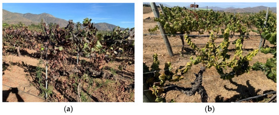 Grapevine yellows in Chile: (a) variety Pinot noir with reddening of the leaves; (b) variety Chardonnay with yellowing of the leaves.