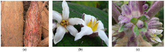 Symptoms of ‘Ca. P. pruni’ in Colombia: (a) cassava roots in which the one on the right is infected by 16SrIII-L phytoplasmas; (b,c) S. quitoense (“lulo”) with flower and bud malformations infected by 16SrIII-F phytoplasmas.