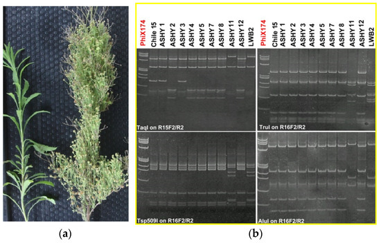 Erigeron showing severe witches’ broom symptoms associated with the presence of ‘Ca. P. fraxini’ (16SrVII) in (a) on the right; in (b) polyacrylamide 6.7% gels showing the restriction profiles of phytoplasma 16SrVII-A from Chile (Chile 15) compared with several strains of ash yellows (ASHY 1 to 8 and 11, 12, and LWB2) from the United States of America, kindly provided by W. Sinclair. The enzymes are at the bottom of each figure and the marker (PhiX174) is HindIII digested.