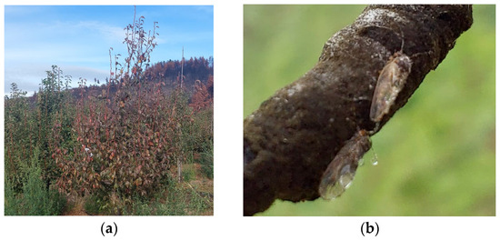 - Valle, D.; Burckhardt, D.; Mujica, V.; Zoppolo, R.; Morelli, E. The occurrence of the pear psyllid, Cacopsylla bidens (Šulc, 1907) (Insecta: Hemiptera: Psyllidae), in Uruguay. Check List 2017, 13, 2088. [Google Scholar] [CrossRef]