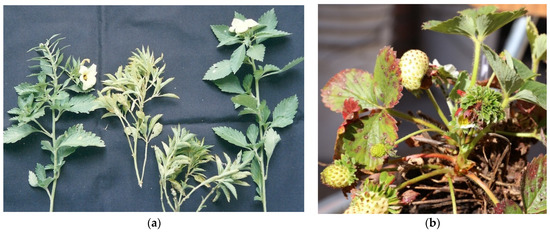 The 16SrIII-J ribosomal subgroup infects several plant species: garlic, tomato, summer squash, Bellis perennis L., sunflower, cassava, and sugar beet. The symptoms of infected garlic plants were leaf reddening or yellowing, decline, and plant death. Bulb production was low, and cloves were deformed [50]. Tomato plants showed reddish and coriaceous leaves, and in summer squash and B. perennis, virescence symptoms appeared [53]. Sunflower plants showed virescence, phyllody, flower malformation, shortened internodes, and abnormal branches [54]. Dwarf cassava plants with witches’ broom and chlorosis were infected with the 16SrIII-J phytoplasma [55]. Wilting and yellowing were observed in sugar beet, fodder beet, and chard plants infected with the same phytoplasma [56].