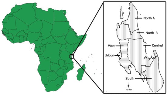 The island of Zanzibar is a landmass of approximately 2460 km2 that is situated 35 kilometres (km) off the coast of east–central Africa and consists of six administrative districts. Each district is further divided into various shehias, which are administrative wards containing one or more villages. Of the six districts, two (the ‘Urban’ and ‘West’ districts) are primarily urban areas that are characterised by higher population densities and more developed infrastructure. The other four districts (the ‘North A’, ‘North B’, ‘Central’, and ‘South’ districts) are primarily rural areas that are characterised by lower population densities and less developed infrastructure [37] (Figure 1).