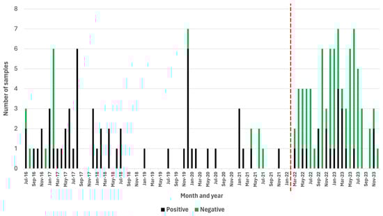 Positive and negative samples subjected to rabies diagnosis before (July 2016–February 2022) and after (March 2022–December 2023) the RAIDER toolkit had been implemented. Months where no vertical bars are present indicate a month where no samples were submitted for rabies diagnosis. The red vertical line denotes the start of the study period.