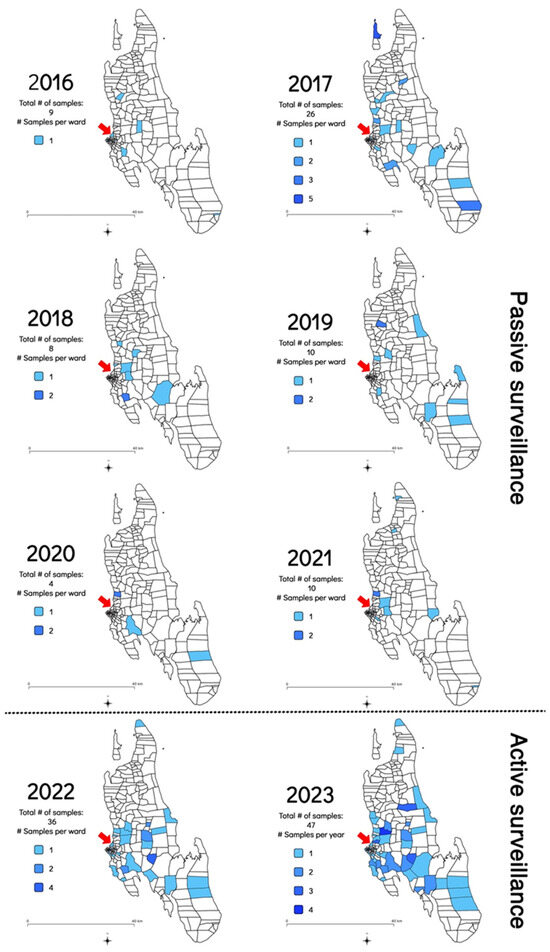 In addition to the increase in the frequency of sample submission and rabies cases diagnosed, the geographical distribution of the samples submitted for rabies diagnosis was also investigated to determine whether the implementation of the RAIDER toolkit resulted in samples being collected from more shehias across the island. Between July 2016 and February 2022, samples originated from an average of nine shehias per year (Min: 3 in 2020; Max: 17 in 2017) (Figure 3 and Table S1). In contrast, between March 2022 and December 2023, samples originated from an average of 31 shehias per year (Min: 29 in 2022; Max: 32 in 2023) (Figure 3 and Table S2). This constituted a statistically significant three-fold increase in the number of shehias where samples were collected and diagnosed (p = 0.001235).