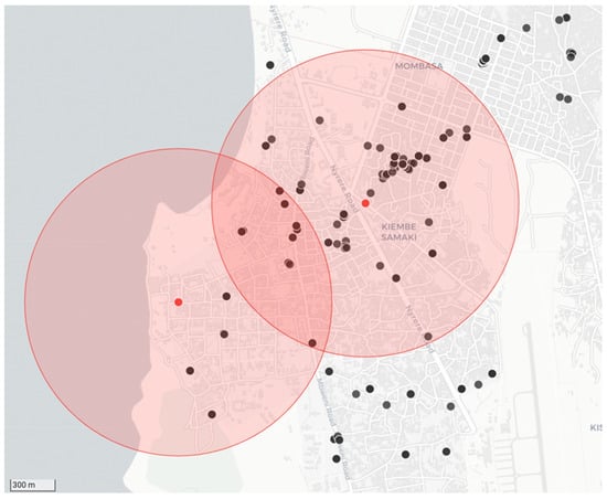 Example of the data collected during a strategic dog vaccination campaign that was initiated in response to positive diagnostic screening results. The location of the two samples that tested positive for rabies are represented by red dots with a 1 km catchment area shown around each of them as shaded red circles. The black dots show the locations where dogs were vaccinated in response to the cases.