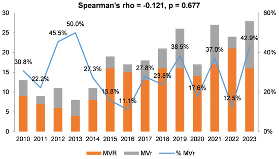 A total of 251 patients with either active or healed mitral valve endocarditis were included in our study: 180 (71.7%) underwent mitral valve replacement, and the remaining 71 (28.3%) underwent mitral valve repair. The repair rate for mitral valve endocarditis has remained stable over time (p = 0.677), as illustrated in Figure 1. Patients with multi-valve disease were also included.