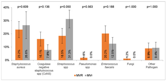 Gram-positive etiology distribution in patients undergoing MVR or MVr.