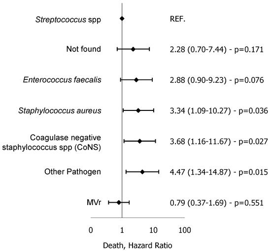 Regarding microbial etiology, Staphylococcus aureus was the main pathogen responsible for IE in our cohort (56, 22.3%), followed by Streptococcus spp. (51, 20.3%), Enterococcus faecalis (42, 16.7%), and coagulase-negative staphylococci spp. (CoNS), n (32, 12.7%). No differences were found among Gram-positive etiology distribution in patients undergoing MVR or MVr (Figure 2).