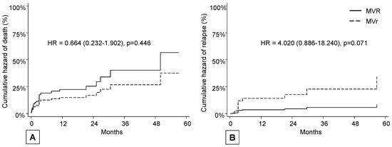 Relapse occurred in six patients (8.5%) in the repair group after a median time of 4.0 months and in six (3.3%) in the replacement group after a median follow-up of 6.9 months; even if not statistically significant, a trend was observed in favor of MVR in terms of hazard ratio (p = 0.071) (Figure 4, panel B).