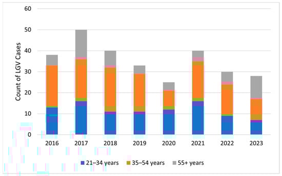 Clinically defined LGV cases by age group and year among HIV-infected individuals, Veterans Health Administration, 2016–2023. N = 284.