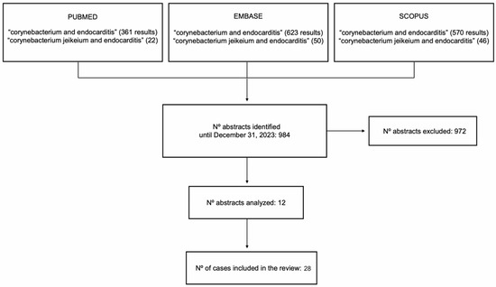 A search was made of articles published in English and Spanish up to 31 December 2023, in the PubMed-MEDLINE, Embase, and Scopus databases. Cases without a diagnosis of infective endocarditis or produced by corynebacteria other than C. jeikeium were excluded, as well as those articles whose content was not accessible or were written in a language other than English or Spanish. The search terms were “Corynebacterium and endocarditis” and “Corynebacterium jeikeium and endocarditis”. The final review included 12 articles containing 28 cases of C. jeikeium endocarditis. Figure 1 details the selection and inclusion process of the different studies.