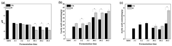 The fermentation treatment of the SBM resulted in a reduction in pH value compared to the original sample in both the control and treated groups (Figure 1). There was no significant difference in the pH value of the control group within 30 d of fermentation (p > 0.05). However, the pH values of the H group were significantly higher than the initial pH after 3 d of fermentation (p < 0.05), but these subsequently decreased to below 4.20. After 3 d of fermentation, there was no significant difference in pH between the control and treatment groups (p > 0.05). However, the pH of the H group remained lower than that of the control group, and the pH of the H group decreased to below 5.00 during all fermentation times.