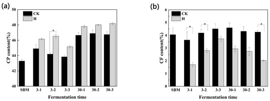 As depicted in the Figure 2a, the CP content of both experimental groups following fermentation and aerobic exposure exhibited a statistically significant increase compared to the initial SBM composition (p < 0.05). Different fermentation duration had a significant effect on the CP content in SBM. The CP contents in both control and H groups were significantly higher at 30 d of fermentation compared to 3 d (p < 0.05). Additionally, the CP levels in the group H were consistently higher than that in the control, and with a significant increase observed at the second opening after 3 d of fermentation (p < 0.05).