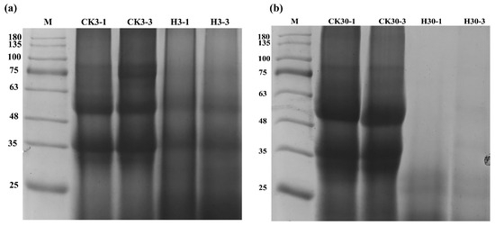 Protein degradation among control and treatment groups aerobic exposure for 1–3 days after 3 and 30 days fermentation. (a,b), protein degradation among control and treatment groups aerobic exposure for 1 and 3 days after 3 (a) and 30 days (b) fermentation, respectively. CK3-1, CK3-3, CK30-1, and CK30-3 and H3-1, H3-3, H30-1, and H30-3: control check and treated groups of aerobic exposure 1 d and 3 d after fermentation at 3 d and 30 d, respectively. CK, the control group (50% SBM + 50% water). H, the treatment group (50% SBM + 39% water + 10% ZZUPF95 (108 CFU/mL) + 1% acid protease).