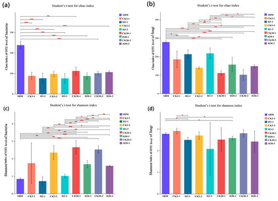 Alpha index of microbes among control and treatment groups aerobic exposure for 1 and 3 days after 3 and 30 days fermentation. (a,b) Chao index of bacteria and fungi; (c,d) Shannon index of bacteria and fungi. * indicates significant differences (p < 0.05), ** indicates p < 0.01, *** indicates p < 0.001. SBM, soybean meal, CK3-1, CK3-3, CK30-1, and CK30-3 and H3-1, H3-3, H30-1, and H30-3: control checks group and treated group of aerobic exposure at 1 d and 3 d after fermentation at 3 d and 30 d, respectively. CK, the control group (50% SBM + 50% water). H, the treatment group (50% SBM + 39% water + 10% ZZUPF95 (108 CFU/mL) + 1% acid protease).