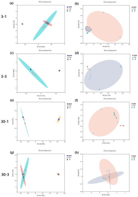 Principal coordinate analysis on genus level of bacterial (a–d) and fungal (e–h) communities among control and treatment groups aerobic exposure for 1 and 3 days after 3 and 30 days fermentation. SBM, soybean meal; CK, the control group (50% SBM + 50% water). H, the treatment group (50% SBM + 39% water + 10% ZZUPF95 (108 CFU/mL) + 1% acid protease). Respectively, 3-1, 30-1, 3-3, and 30-3: aerobic exposure 1 d and 3 d after fermentation at 3 d and 30 d.