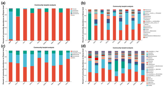 The abundance of both bacteria and fungi changed significantly before and after SBM fermentation, with a significant reduction in abundance being observed (p < 0.001) in Figure 4. The bacterial abundance in group H did not show significant changes during each period, but it was consistently lower than that of the control group, except for the 3 d of aerobic exposure after 30 d of fermentation. In the fungi community, the abundance of each group was reduced significantly compared to the original SBM, but the abundance of the fungi community increased in group H compared to the control group (Figure 4a,b).