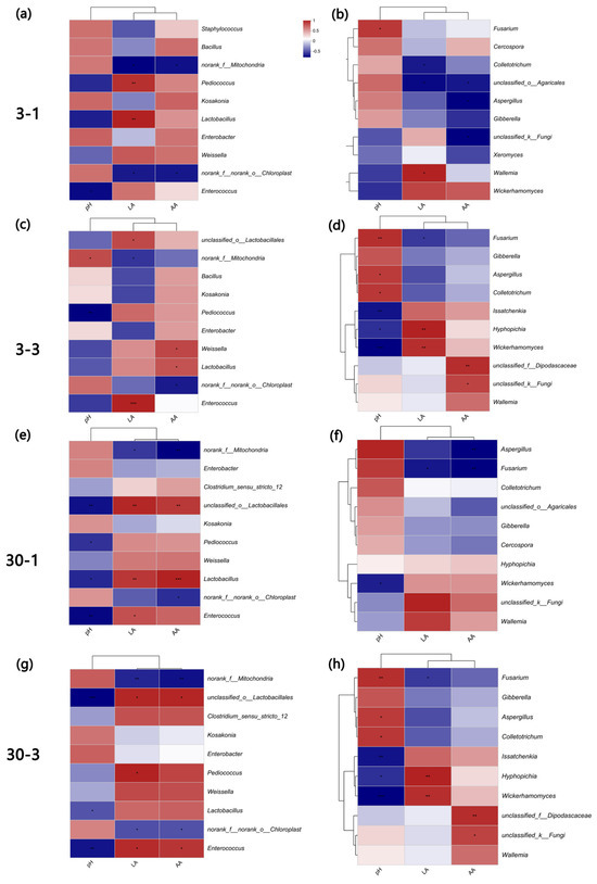 Spearman correlation heatmap of abundance between the top 10 most enriched bacterial (a–d) and fungal (e–h) communities during control and treatment groups aerobic exposure for 1 and 3 days after 3 and 30 days fermentation. * indicates significant differences (p < 0.05), ** indicates p < 0.01, *** indicates p < 0.001. LA, lactic acid; AA, acetic acid. SBM, soybean meal. CK3-1, CK3-3, CK30-1, and CK30-3 and H3-1, H3-3, H30-1, and H30-3: control checks group and treated group of aerobic exposure at 1 d and 3 d after fermentation at 3 d and 30 d, respectively. CK, the control group (50% SBM + 50% water). H, the treatment group (50% SBM + 39% water + 10% ZZUPF95 (108 CFU/mL) + 1% acid protease).